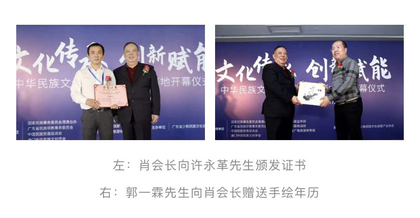本次活动迎来了一场特别的赠送仪式。为感谢广东省少数民族文化创意产业协会对推动我国少数民族文创与非遗文化产业发展做出的努力与贡献,苏派砖雕文化协会会长、非遗传承人许永革特别向协会赠送代表作品砖雕《和合鸳鸯》。活动现场,肖俊华会长向许永革先生颁发证书,作为双方友谊的见证,同时,京古斋文化传播有限责任公司董事长郭一霖向肖会长赠送了精美的手绘年历。
