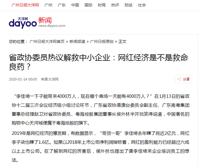 李佳琦赚钱超越上市公司、薇娅十几秒卖空一万件……1月13日,广东省政协十二届三次会议,委员在经济分组里展开热烈讨论。网红经济、直播带货,新消费时代里,中小企业、传统产业如何借力电商进入转型升级,成为委员们关切的话题。
