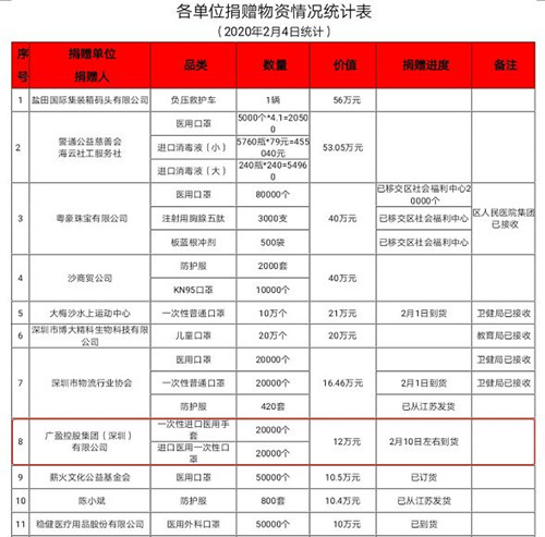 2020年2月4日上午,盐田区组织开展抗击疫情物资捐赠仪式。盐田区委副书记、区长杨军现场指导捐赠工作。金雅福集团旗下金雅福首饰、广盈控股与粤豪珠宝、大百汇、盐田国际、海云社工服务社、香港盐田同乡联谊会总会等社会各界一起踊跃捐款捐物,其中,金雅福首饰捐赠深圳市盐田区慈善会人民币50万元整,广盈控股捐赠深圳市盐田区社会福利中心一次性医用手套2万个、进口一次性医用口罩2万个,均定向用于盐田区疫情防控工作。