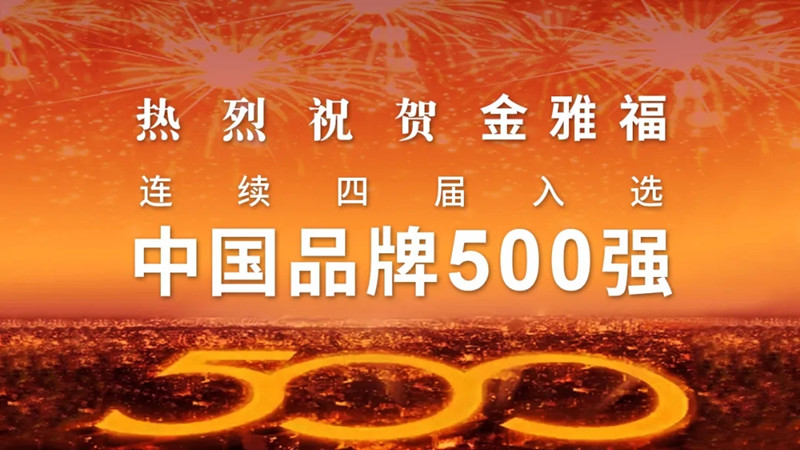 2020年5月10日“中国品牌日”,由专业品牌评价机构Asiabrand发起主办,中国亚洲经济发展协会品牌管理专业委员会和亚洲品牌网联合主办的“2020中国品牌500强”发布会通过网络直播形式隆重举行。会议发布了中国品牌500强榜单,金雅福连续四年荣登榜单,排名第143名,品牌价值482.44亿元。