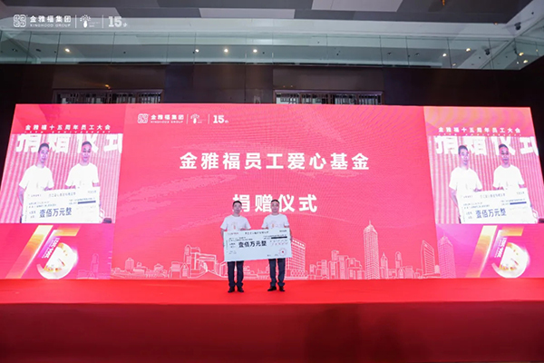 15年的潜心发展,稳健前行,集团辉煌的成就离不开全体金雅福人的努力。在此次大会上,黄仕坤董事长宣布集团再向员工爱心基金捐赠100万,用于帮扶困难员工及其家属。