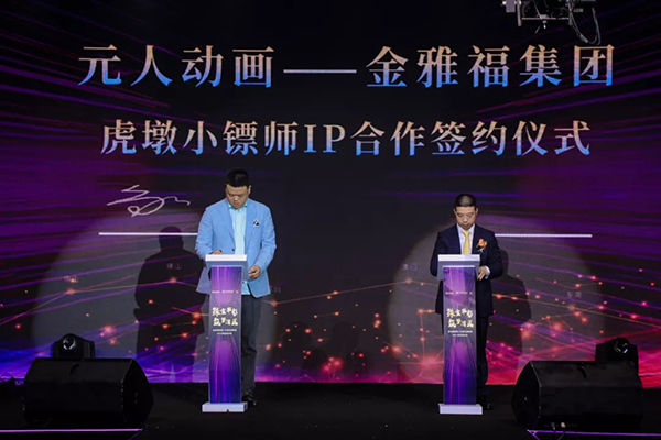 十五年来,金雅福专注将新文创融入黄金珠宝产品设计,通过挖掘、传承并创新传统文化来助力“国潮”产品。晚会现场,金雅福集团董事长黄仕坤与深圳市元人动画邹燚成功签约《虎墩小镖师》IP,《虎墩小镖师》是全网拥有1000万+粉丝,视频播放量达100亿+的优质原创国风动漫,传递中国人坚守“信与义”的普世价值观,以及对“生命和家人”的思考。生肖虎年,金雅福将携手《虎墩小镖师》共同打造虎年大热IP精品,弘扬中国传统精神,弘扬社会正能量。