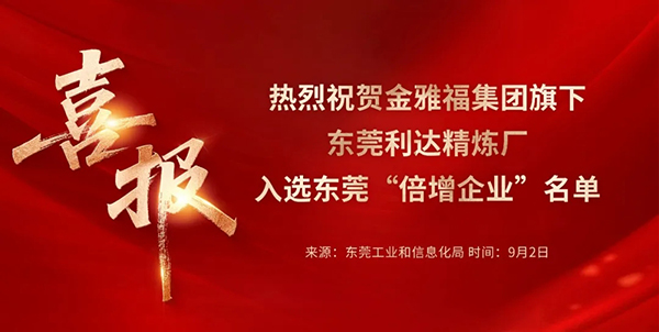 9月2日,东莞工业和信息化局发布关于印发2025年东莞市“倍增企业”名单的通知,金雅福集团旗下东莞市利达黄金精炼有限公司(简称“东莞利达精炼”)凭借企业综合竞争力,荣耀入选2025年东莞市“倍增企业”名单,获得政府的肯定和鼓励。