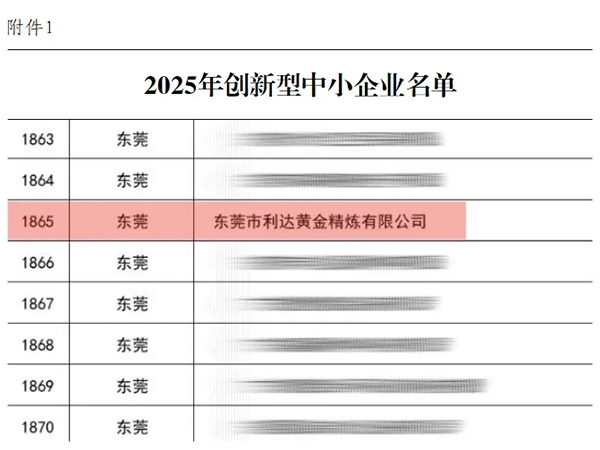 近日,广东省工业和信息化厅发布《关于2025年创新型中小企业和通过复核的创新型中小企业名单的通知》,金雅福集团旗下东莞市利达黄金精炼有限公司(以下简称“东莞利达精炼”)凭借卓越创新能力,成功获评2025年广东省创新型中小企业。