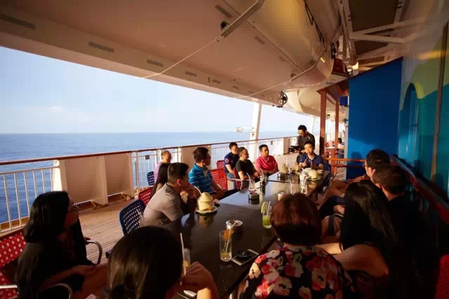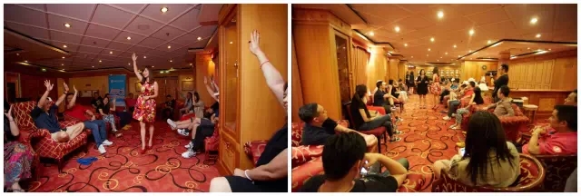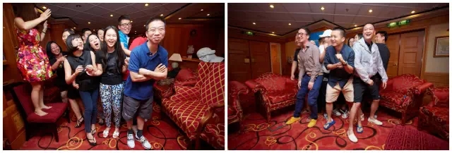 安置好行李,用完晚餐,已是华灯初上时分。此时轮船早已远离码头,驶向公海。海风舒缓,浪涛轻拍,手机已搜索不到通讯信号,WiFi也时有时无。这样相对封闭的环境,似乎更适合心与心的沟通交流——此行的第一场学习分享会在13层甲板上妲芬娜酒吧的一角开始了。新加入商会的青商兄弟们纷纷向大家展示自我风采,分享新鲜资源;早已熟识的商会老友们也随着话题的开展尽情倾吐心声,或谈及家庭,或说到创业历程。一时间众人话题不断、感慨万千,大家在这茫茫大海上共度至深夜方才散去。