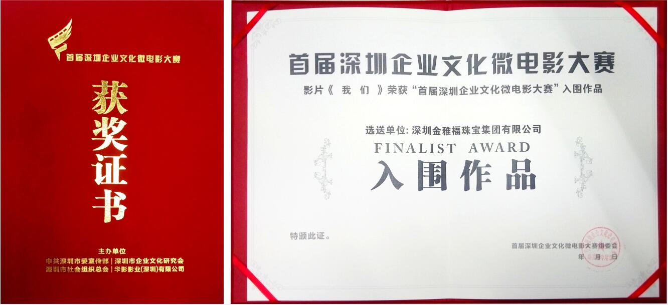2017年3月,金雅福集团首部微电影《我们》在2016首届深圳企业文化微电影大赛参赛的118家企业,258部微电影作品中冲出重围,获得了“入围作品”奖。《我们》是2016年十周年之际,金雅福集团推出的自编自导自演的第一部微电影。影片一经发布,就成功引起了大家的共鸣。为了更广泛传扬金雅福企业精神,《我们》还报名参加了本次大赛。